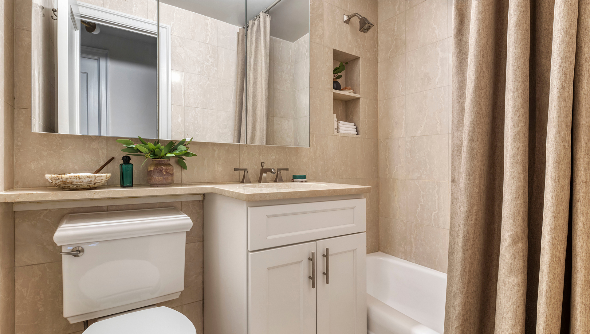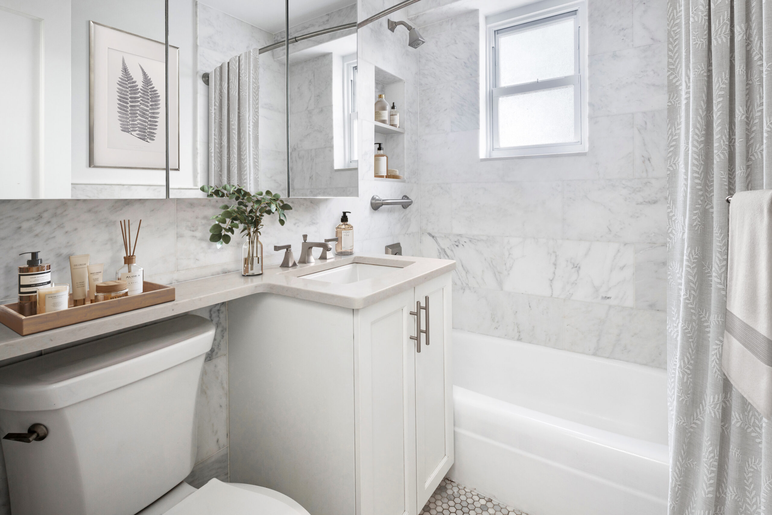 Marble and porcelain finishes.